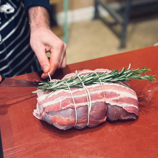 The final session of the class explores partridge. Joey demonstrates how to prepare the bird for the oven, removing the legs and wings, stuffing them with garlic and fresh herbs, then wrapping and trussing the partridge in bacon. Guests then prepare a brace of partridges themselves..